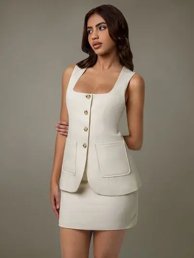 Elevate your style with our Button Down Sleeveless Top and Skirt Set. Perfect for any occasion, this set is a must-have for any fashion-forward individual. Shop now and experience the uniqueness of this product for yourself.