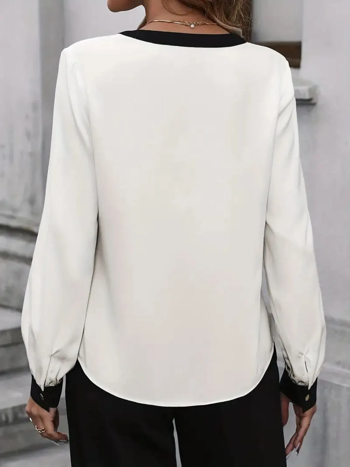 This blouse is incredibly versatile, making it a fantastic addition to any woman's closet. You can pair it with tailored trousers for a polished look or with jeans for a more casual vibe. Because of its stylish yet adaptable nature, the blouse can enhance your outfit for many different occasions. So, whether you're dressing up for a business meeting or keeping it casual, the Contrast Notched Long Sleeve Blouse has you covered.
